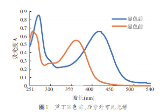 黃酮類(lèi)化合物經(jīng) AlCl3顯色后,與鋁離子形成穩(wěn) 定的絡(luò)合物,苯甲酰基部分引起的吸收帶(300~ 400 nm)紅移,吸光度明顯增大且專(zhuān)屬性提高。蘆丁 經(jīng) AlCl3顯色后,其 365 nm 處吸收峰紅移至 416 nm, 且吸光度有所增加,見(jiàn)圖1。