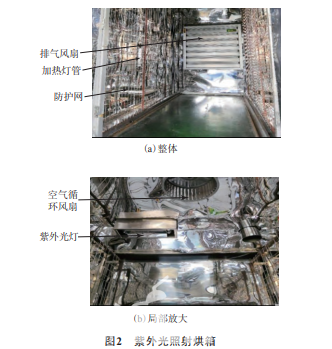 為橡膠密封條光觸媒除味設計的真空烘箱(上海精宏DZF-6090)如圖2所示,該烘箱的紫外光照射強度遠遠高 于正常太陽光的紫外光強度,且適應橡膠密封條 的批量處理。烘箱中加熱燈管保證烘箱處于一定 的溫度范圍內(nèi),空氣循環(huán)風扇保證空氣循環(huán)和烘 箱內(nèi)溫度分布均勻,紫外光燈分布在烘箱頂部和 兩側,保證橡膠密封條在處理過程中被全面照射, 提高處理效率。