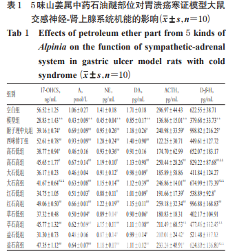 知母、高良姜、大高良姜、紅豆蔻、草豆蔻、益智飲片 (批號分別為 150601、160101、170912、160605、170801、 170718)均購自南寧生源中藥飲片有限責任公司,經廣 西中醫(yī)藥大學中藥鑒定學教研室田慧教授鑒定為真品。 附子理中丸(陽性對照,北京同仁堂科技發(fā)展股份 有限公司制藥廠,批號:15010241,規(guī)格:每 100 粒重 10 g);西咪替丁片(陽性對照,廣東華南藥業(yè)集團有限公 司 ,批 號 :150802,規(guī) 格 :0.2 g);17- 羥 皮 質 類 固 醇 (17-OHCS)、腎上腺素(A)、去甲腎上腺素(NE)、多巴胺 (DA)、促腎上腺皮質素(ACTH)、多巴胺-β-羥化酶 (D-β-H)試劑盒(上海酶聯(lián)生物科技有限公司,批號分別 為 RA20057、RA20337、RA20557、RA20050、RA20014、 RA20218);乙醇、乙酸乙酯等試劑均為分析純,水為蒸 餾水。