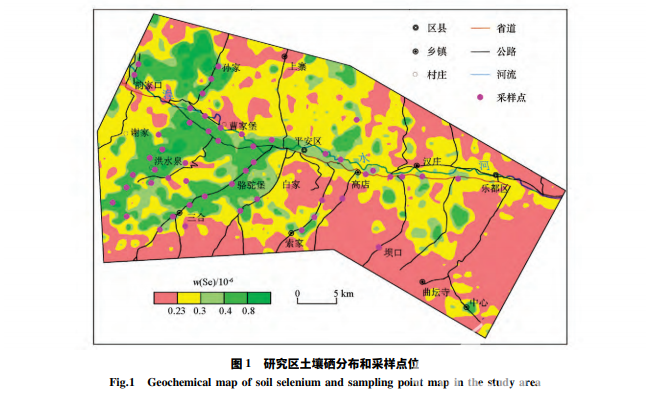 研究區(qū)耕地主要分布在湟水河及各支溝谷地兩 側(cè)。在研究區(qū)耕地中選擇典型富硒( Se≥0.4×10-6 ) 區(qū)和低硒區(qū)布設(shè)表層土壤樣品共 50 件,具體采樣點(diǎn) 位見(jiàn)圖 1。為保證樣品代表性,采取多點(diǎn)組合采樣 的方法,即在設(shè)計(jì)樣點(diǎn)位置選擇 1 個(gè)主點(diǎn),并在同一 地塊中以“梅花法”選擇 3 ~ 4 個(gè)副點(diǎn)采集表層 0 ~ 20 cm 耕作層土樣,具體方法為用鐵鍬先挖采樣坑,然 后用竹片去除與金屬采樣器接觸的土壤,再采集所 需樣。每件樣品采集后須清除干凈工具上的泥土,將采集的樣品掰碎去除根系、石塊等雜物后將主副 點(diǎn)樣品混合,用四分法留取 1 ~ 1.5 kg 裝入布袋中, 同時(shí)記錄采樣點(diǎn)所處的土壤類(lèi)型、成土母質(zhì)、土地利 用類(lèi)型等信息。采集的樣品需陰干晾曬,過(guò) 20 目尼 龍篩取篩下物 200 g 裝袋封裝送至實(shí)驗(yàn)室分析測(cè) 試。樣品測(cè)試由安徽省地質(zhì)實(shí)驗(yàn)研究所承擔(dān)完成。 實(shí)驗(yàn)室根據(jù)地質(zhì)礦產(chǎn)行業(yè)標(biāo)準(zhǔn)《多目標(biāo)區(qū)域地球化 學(xué)調(diào)查規(guī)范( 1 ∶ 250 000) DZ /T0258-2014》、中國(guó)地 質(zhì)調(diào)查局《生態(tài)地球化學(xué)評(píng)價(jià)樣品分析技術(shù)要求 ( 試行) 》( DD2005-03) 、《生態(tài)地球化學(xué)評(píng)價(jià)樣品分 析外部檢查質(zhì)量控制暫行規(guī)定》和《生態(tài)地球化學(xué)評(píng)價(jià)樣品分析技術(shù)要求補(bǔ)充規(guī)定》等相關(guān)技術(shù)標(biāo) 準(zhǔn),結(jié)合實(shí)驗(yàn)室的實(shí)際情況采用國(guó)標(biāo)提取方法,選用 實(shí)驗(yàn)室最先進(jìn)的分析儀器測(cè)試各項(xiàng)指標(biāo)含量。將樣品放置于小于 60 ℃ 的恒溫干燥箱(上海精宏實(shí)驗(yàn)設(shè)備有限公司)內(nèi)充分 烘干。稱(chēng)取 10 g 烘干樣品,用 25 mL 趕凈二氧化碳 的水浸泡,用離子選擇性電極法( ISE) 測(cè)定 pH。分 取 10 g 干樣經(jīng)瑪瑙球磨機(jī)研磨至 200 目,在 750 ℃ 下艾斯卡半熔,熱水提取后分取提取液,加熱酸化, 硼氫化鉀還原,原子熒光法( AFS) 測(cè)定土壤總 Se。 分 取100g干樣經(jīng)瑪瑙球磨機(jī)研磨至1 0 0目,稱(chēng)取 2.5 g 于 250 mL 聚乙烯燒杯中,加蒸餾水 25 mL,超 聲提取 30 min 離心分離,清液經(jīng) 0.45 μm 濾膜過(guò)濾, 原子熒光光譜法( AFS) 測(cè)定水溶態(tài) Se,殘?jiān)?jīng)水洗 后,棄去水相留下殘?jiān)?br />