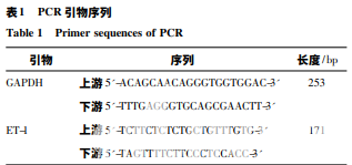 ET-1 mRNA 含量 取新 鮮冰凍組織約 100 mg,加 trizol 試劑,并研磨裂解。 加入三 氯 甲 烷 200 μL,混 勻 后 靜 置 5 min。4 ℃ 12 000 r·min - 1,離心 15 min,轉(zhuǎn) 移 上 層 至 1. 5 mL EP 管中,加入異丙醇 400 μL,混勻后靜置 10 min。 離心,棄 上 清,加 入 75% 乙 醇 1 mL,混 勻 后 離 心 5 min。棄上清后,于空氣中干燥 RNA 沉淀,將其溶 于 20 μL DEPC 水中,取溶解后的 RNA 2 μL 用微量 分光光度計測定 RNA 的純度和濃度。根據(jù) A 計算 樣品 RNA 的 濃 度。逆 轉(zhuǎn) 錄 成 cDNA,反 應(yīng) 條 件: 25 ℃ 5 min,50 ℃ 15 min,85 ℃ 5 min,4 ℃ 10 min。 Real-time PCR 檢測,cDNA 做 10 倍稀釋,反應(yīng)條件: 50 ℃ 2 min,95 ℃ 10 min; 95 ℃ 30 s,60 ℃ 30 s, 40 個循環(huán)。繪制熔解曲線,最終以 2 - ΔΔCt 表示。