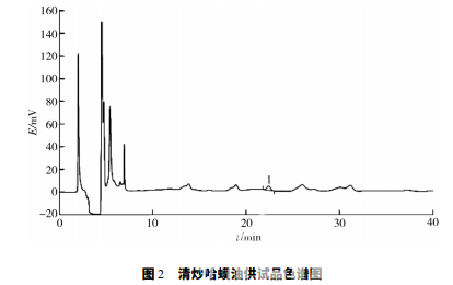 分別取對照品溶液、清炒哈蟆油供試品溶液,按照上述色譜條件進行分析,結果如圖 1 和圖 2,待測色譜 峰與相鄰色譜峰基本分離,理論塔板數按 1 - 甲基海因峰計算均不低于 3 000。