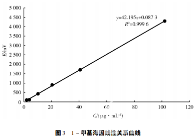 精密吸取上述配制好的 1 - 甲基海因對照品母液 0. 2、0. 4、1. 0、2. 0、4. 0 mL 分別置 10 mL 量瓶中,加甲 醇稀釋定容到刻度,搖勻,使質量濃度分別為 2. 04、4. 08、10. 20、20. 40、40. 80、102 μg /mL。將 6 種溶液分別 注入高效液相色譜儀中,按照色譜條件進行測定。繪制標準曲線( 圖 3) ,得回歸方程 y = 42. 195x + 0. 087 3 ( R2 = 0. 999 6) ,結果表明,1 - 甲基海因質量濃度在 2. 04 ~ 102 μg /mL 范圍線性關系良好。