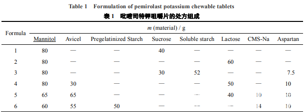 MP5002 電子天平(上海舜宇恒平科學(xué)儀器有限公司),RC8MD 溶出儀(天津天大天發(fā)科 技有限公司),UV-2600 紫外-可見分光光度計(日本 Shimadzu 公司),標(biāo)準(zhǔn)篩(上虞五四建材 儀器廠),精宏DHG-9246A 電熱恒溫鼓風(fēng)干燥箱(上海精宏實驗設(shè)備有限公司),ZPS008 實驗室旋 轉(zhuǎn)式壓片機(jī)(上海天祥健臺制藥器械有限公司),BJ-2A 崩解時限測定儀(天津國銘醫(yī)藥設(shè)備有 限公司),YD-35 智能片劑硬度儀(天津天大天發(fā)科技有限公司),KBF720 穩(wěn)定性試驗箱(德 國 Binder 公司)。 吡嘧司特鉀(浙江金立源藥業(yè)有限公司,批號 0101820170412),蔗糖(南寧桂之隆藥用輔料 有限公司),甘露醇、微晶纖維素(旭城株式會社),可溶性淀粉、羧甲基淀粉鈉、乳糖、硬酯酸鎂(安徽山河藥用輔料股份有限公司),預(yù)膠化淀粉(湖州展望藥業(yè)有限公司),阿司巴坦(西 安泰華醫(yī)藥科技有限公司),桔子香精(泰興市三華食品添加劑廠),乙醇(湖南湘易康制藥有 限公司)。