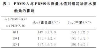 表1 PDMS-A與 PDMS-B質量比值對銅網涂層水接 觸角的影響 m(PDMS-A)∶ m(PDMS-B) θCA(正己烷)/(°) θCA(甲苯)/(°) 8∶1 149.8±3.3 153.3±2.3 10∶1 151.6±2.4 153.6±3.6 12∶1 147.1±1.9 156.1±2.4 Sylgard184包含兩個組分,其中 PDMS-A 溶液為乙烯基封端的 PDMS,PDMS-B為甲基氫基硅氧 烷共聚物、含鉑催化劑、抑制劑所組成的固化劑。不同的 PDMS-A 與 PDMS-B配比影響 PDMS的固化 速率與固化程度,進而影響粒子的運動能力,因而影響成膜情況及涂層表面接觸角。另一方面,在成膜 過程中,溶劑的揮發速率也能影響粒子的運動,從而對膜的表面形貌及粗糙度造成影響。因此我們首先固定浸涂液組分為2.5gPDMS與3.125gSiO2,將 兩者溶解在50mL正己烷或甲苯溶液中,銅網在浸涂 液 中 的 浸 泡 時 間 為 5 min,銅 網 的 提 拉 速 度 為 0.05mm/s,涂層的固化溫度為80℃。改變PDMS-A 與 PDMS-B 的 質 量 比,考察其對銅網涂層水接觸 角 (θCA)的影響,同時比較溶劑正己烷與甲苯對成膜后水 接觸角的影響。其結果見表1。