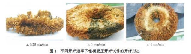 軟化處理后的竹筒在開纖試驗機中以開纖速 率為單一變量進行錐模受壓開纖試驗,各試件的開 纖形態(tài)如圖 1 所示。