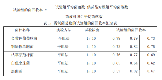 取上述制備好的 1:10 供試液 9.9ml 5 支,分別加入金黃色葡萄球菌,銅綠假單胞菌, 枯草芽孢桿菌,白色念珠菌和黑曲霉 0.1ml(含菌量約為 103~104 cfu/ml),混勻。分別取 1ml 注入無菌平皿中,傾注胰酪大豆胨瓊脂培養(yǎng)基,混勻,倒置培養(yǎng)。按平皿傾注法測定其菌落 數(shù),同法測定供試品對(duì)照組及菌液對(duì)照組菌數(shù)。