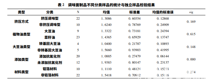 通過對樣品分類統(tǒng)計和分別進行獨立樣品 t 檢驗 得到如下表 2,包括按產(chǎn)品制作方式、原料用油種類、 原料用油的轉(zhuǎn)基因與否、添加抗氧化劑與否及包裝質(zhì) 地為鋁箔材料與否 5 方面進行分類分析,并統(tǒng)計了各組分類的觀測量個數(shù)、平均數(shù)、標(biāo)準(zhǔn)差和平均數(shù)的標(biāo) 準(zhǔn)誤差。其中僅有添加抗氧化劑類型的分析檢驗 sig< 0. 05,所以表明調(diào)味面制品的酸價值的大小與抗氧化 劑的添加與否有顯著差異,其余均無顯著差異。