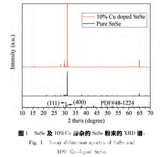 圖 1 給出了未摻雜和摻雜 10% Cu 的 SnSe 粉 末的 XRD 圖譜。兩種 SnSe 粉末的所有衍射峰都可以和正交結構的 SnSe 完全對應起來,為 Pnma 結構 ( XRD 標準識別卡,JCPDS 48 - 1224) ??梢钥吹?, 兩種 SnSe 粉末的最強峰都為 400* ,說明制備合成 的產物都具有{ 100} 表面。經過與標準識別卡比 對,發現兩種 SnSe 的 400* 峰位置都與標準值 2θ = 31. 081°發生了偏離。對于未摻雜的 SnSe,這種偏 離是由于晶體結構中 Sn 空位的存在導致。經 過 Cu 摻雜之后,400* 峰位置向更大的 2θ 偏離,這 表明 Cu 原子進入到了 SnSe 晶格中。這是因為 Cu 離子的尺寸< Sn 離子,所以 Cu 摻雜導致晶格常數減小。
