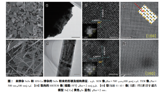 圖 2 顯示了未摻雜和 10%Cu 摻雜的 SnSe 粉末 的形貌及結構特征。圖 2a 是未摻雜 SnSe 粉末的 SEM 像??煽吹胶铣傻漠a物具有典型的片狀形態, 它的橫向尺寸在 30 ~ 200 mm 之間。圖 2b 是 10% Cu 摻雜的 SnSe 粉末的 SEM 像??煽吹綋诫s后產 物形態變成了長條狀或長線狀,它們的寬度都在 30 nm ~ 10 μm 之間。經過研究,發現 SEM 像中直接看 到的表面基本上都為微米片的{ 100} 面,{ 100} 面是 這些微米片上最典型的表面。圖 2c、2d 分別為未摻 雜和 10%Cu 摻雜的 SnSe 粉末的 TEM 像,從襯度看 顯示為單晶體,相應的區域高分辨圖像圖 2e 和 2f 也說明其高質量單晶結構,其中插圖為所選擇區域 的 FFT 圖像,顯示這是取向的 HRTEM 像。本 文對兩種 SnSe 的晶格常數和夾角進行了測量,測量 了 10 個晶格的距離之后算得平均值,未摻雜時 b 軸 和 c 軸方向的晶格常數分別為 0. 4628 nm 和 0. 4484 nm,夾角為 86°,這與報道的 b 軸 0. 444 nm,c軸 0. 4135 nm,夾角 86°一致; 而摻雜 10%Cu 之后 b 軸和 c 軸方向的晶格常數為 0. 4487 nm 和 0. 4380 nm,晶格夾角變為 88°,這些變化說明摻雜 Cu 后 SnSe 晶體發生了晶格畸變,晶格常數變小,與上述 XRD 結果一致??紤]到 Cu 原子與 Sn 原子之間原子 半徑的差異,這種晶格變化證明了 Cu 元素的成功摻 雜。此處需說明的一點: 本文電鏡測量的晶格常數略,這可能與電鏡定標的準確度有關,但 不影響相對值的比較。為了解 SnSe 微米片更詳細的 結構特點,拍攝了它們取向的 HAADF 像( 圖 2 g 和 2h) ,插圖為與之對應的原子結構模型。從中可 以發現 Sn 原子和 Se 原子成對存在,摻雜后原子基本的正交結構沒有發生變化,Cu 原子會替代部分 Sn 原 子并出現在 Sn 原子的位置上。