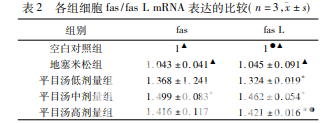 與空白 對照組相比,平目湯各組 fas、fas L 蛋白表達均上調(diào),差異有 統(tǒng)計學(xué)意義( P < 0. 05) ,地塞米松組無統(tǒng)計學(xué)差異( P > 0. 05) 。在升高 fas 表達方面,平目湯高劑量組與平目湯中 劑量組、平目湯低劑量組比較,差異有統(tǒng)計學(xué)意義( P < 0. 05) 。平目湯中劑量組與平目湯低劑量組比較,無統(tǒng)計學(xué) 差異( P > 0. 05) 。