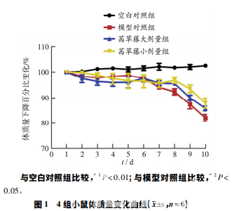 茜草藤大、小劑量組分別 預防性灌胃茜草藤提取物 4.8,1.2 g·kg-1 ,預防性給 予 3 d,空白對照組和模型對照組灌胃等體積純化水; 模型對照組和茜草藤大、小劑量組分別給予 3% DSS 溶液造模,自由飲用,連續飲用 7 d,空白對照組小鼠 給予純化水飲用,直到實驗第 10 天。小鼠灌胃藥物, 給藥體積為 20 mL·kg-1 ,每天 1 次,空白對照組小鼠 給予純化水。